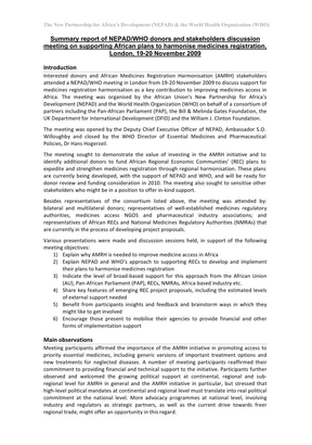 The meeting sought to demonstrate the value of investing in the AMRH initiative and to identify additional donors to fund African Regional Economic Communities’ (REC) plans to expedite and strengthen medicines registration through regional harmonisation. The meeting also sought to sensitise other stakeholders who might be in a position to offer in‐kind support.
